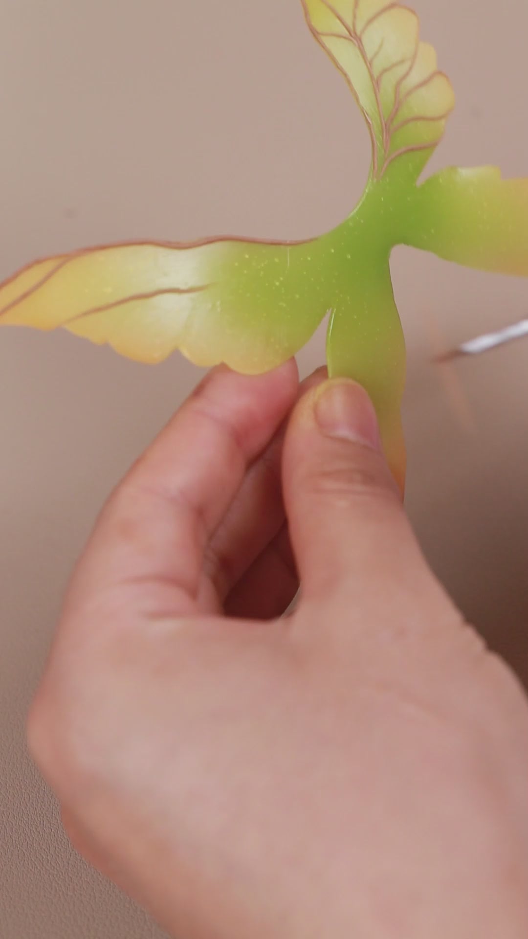 • Wings: Cut translucent resin (AB glue UV resin) into shape; apply texture with coffee-colored fondant overlays